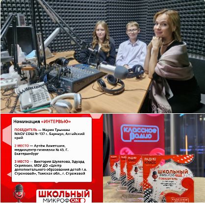 Лауреатами номинации "Интервью" стали начинающие радийщики Виктория Шулепова и Эдуард Скрипкин, воспитанники ДО "Радиожурналистика" ЦДОД.